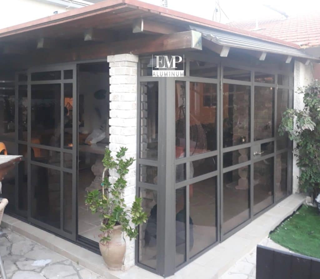 סגירת חדר שמש בחיפה בפרופיל בלגי כהה – עבודת פרימיום שבוצעה על-ידי אי אם פי אלומיניום בע״מ