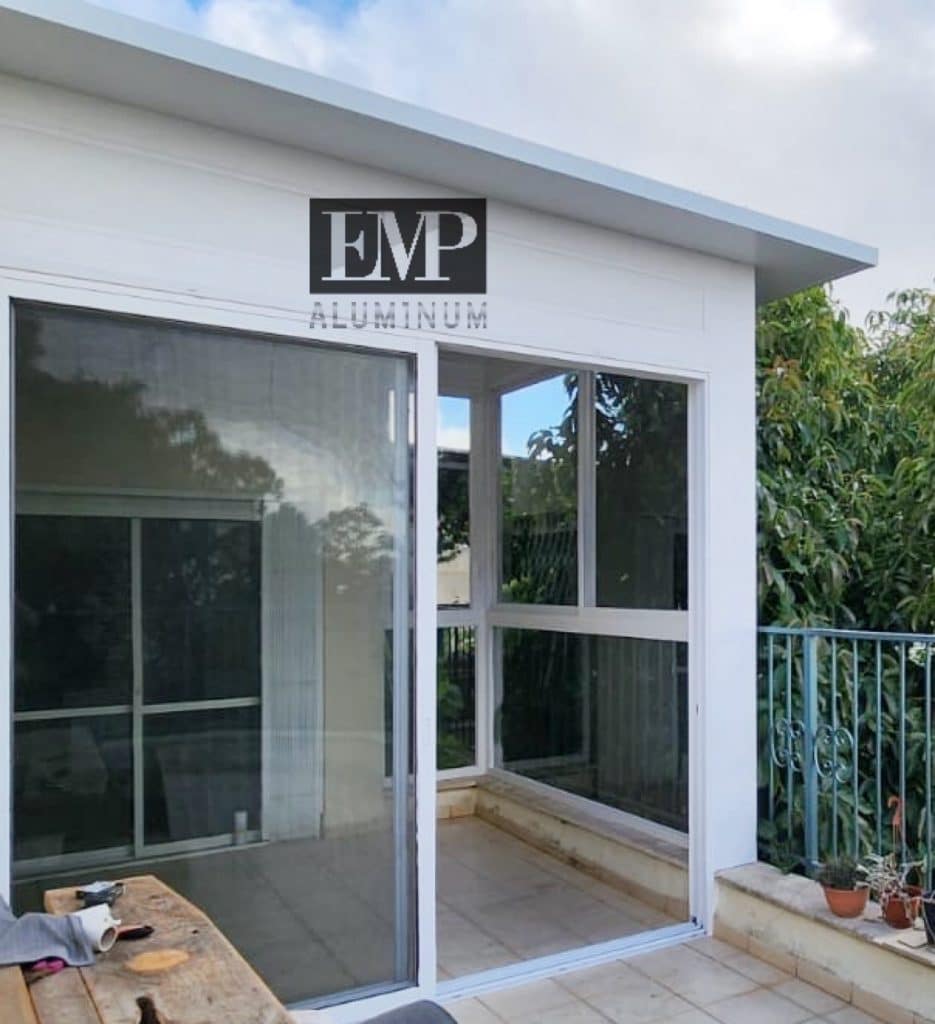 פרויקט סגירת מרפסת בחיפה על גג קיים, שבוצע במלואו על־ידי EMP Aluminum, תוך שימוש במערכת אלומיניום לבנה מודרנית, קווית ונקייה, המשלבת זכוכית שקופה מחוסמת ודלת הזזה רחבה לנוחות מקסימלית.
