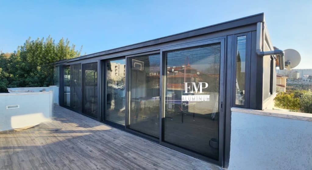 פרויקט סגירת חדר שמש בגג בצפון הארץ, ביצוע מודרני בגוון אפור מט, שבוצע מקצה לקצה ע״י אי אם פי אלומיניום בע״מ, תוך שימוש במערכת אלומיניום איכותית בעלת דלתות הזזה רחבות במיוחד, המספקות פתיחה חלקה, איטום מלא ומראה אדריכלי מרשים שמתמזג בצורה מושלמת עם סביבת החוץ.
